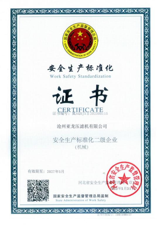 安全生產(chǎn)標(biāo)準(zhǔn)化證書(shū)-滄州亞龍壓濾機(jī)有限公司