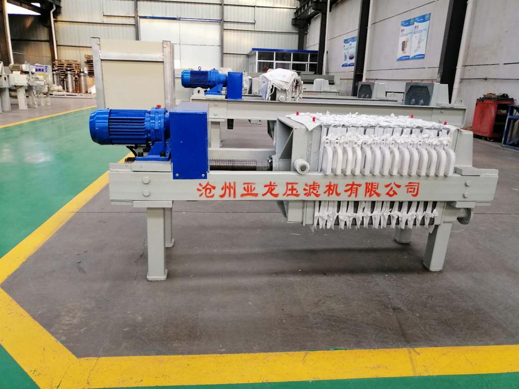在活動壓板上的液壓電機驅動鏈條傳動,然后齒輪與住梁上的齒條嚙合,帶動活動壓板和活動油缸座的前進和后退,實現濾板的一次打開和關閉;兩次和三次打開是由安裝在尾板上的液壓電機通過驅動鏈條傳動,拉動過濾板上的連接塊,帶動過濾板的前進和后退,從而實現濾板的兩次和三次打開。
